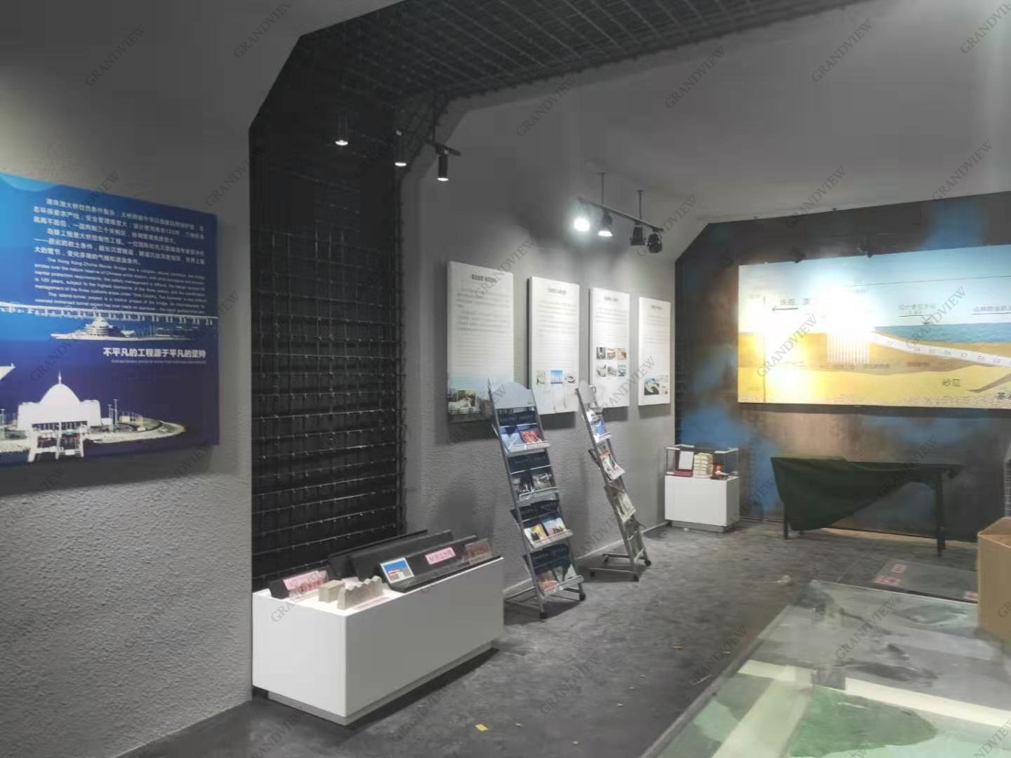 在展廳的布置上,廣角別出心裁,牛頭島預制廠沙盤模型、鋼筋籠模型、建設工具等應有盡有,廣角在有限時間里爭分奪秒,最終成品效果與設計效果圖高度一致,良好地展示了港珠澳大橋的風貌和自身的策劃實力,使雙方達到了共贏。